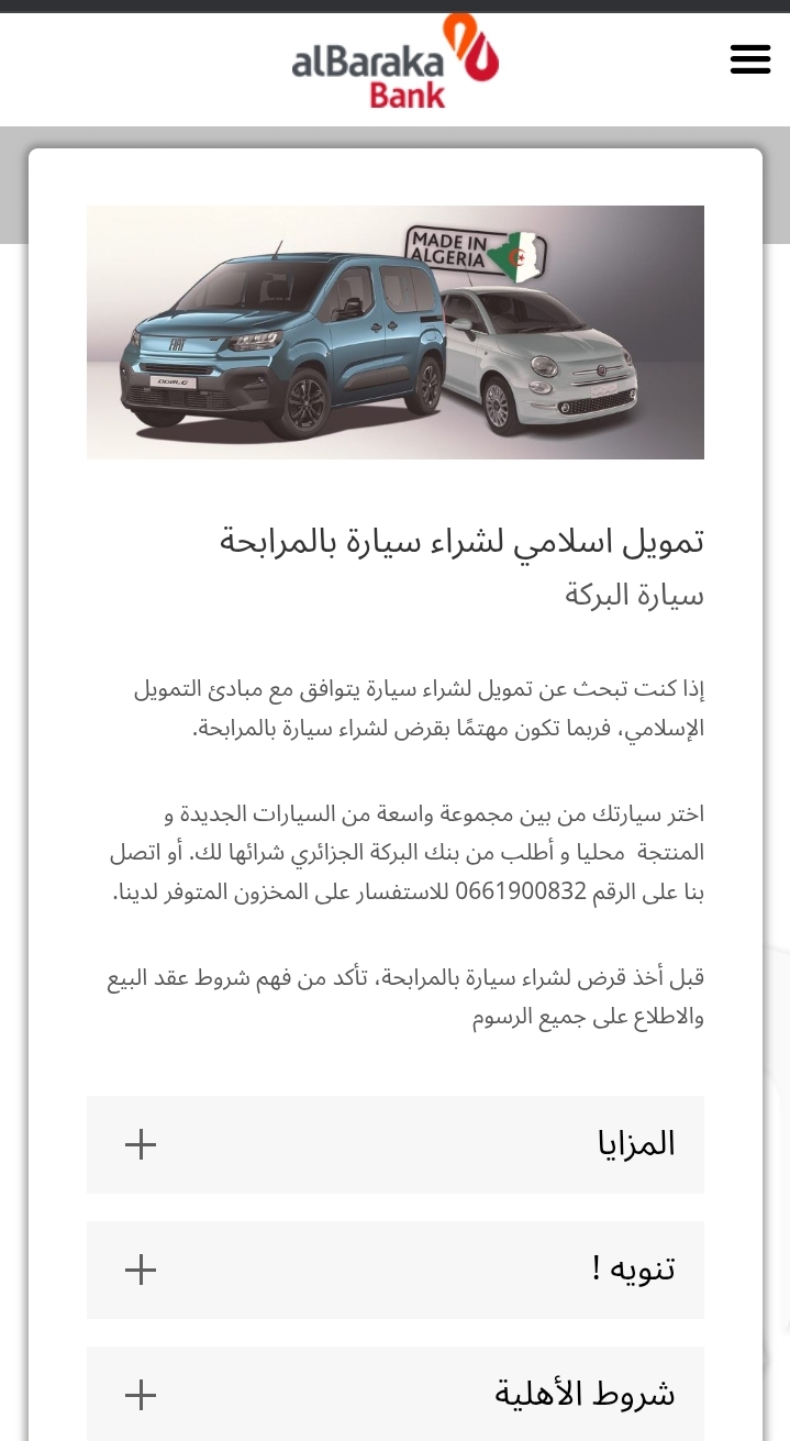 للاستفادة أو لمزيد من المعلومات، يرجى زيارة أحد فروع البنك العشرين المنتشرة في المدن الرئيسية، أو تصفح الموقع الإلكتروني: www.albaraka-bank.dz