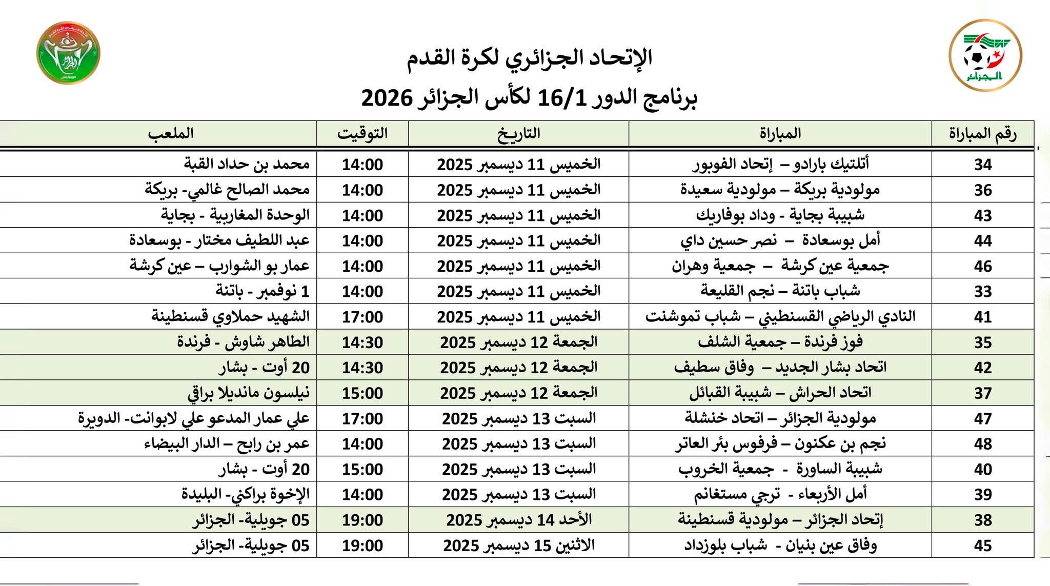 برنامج الدور 1/16 لكأس الجزائر 2026 يجرى على مدار يومي الخميس 11 والجمعة 12 ديسمبر 2025، عبر عدة ملاعب في مختلف أنحاء الوطن، وفق الجدول التالي المستخرج من الرزنامة الرسمية.